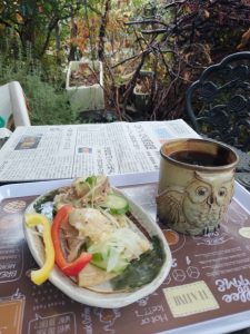 上の子どもの手づくりのパンの上に、生野菜を置いて、昨日の残りのターキーにチーズソースをかけたものです。うまし。
